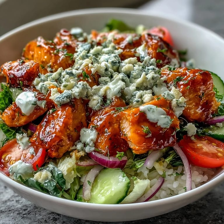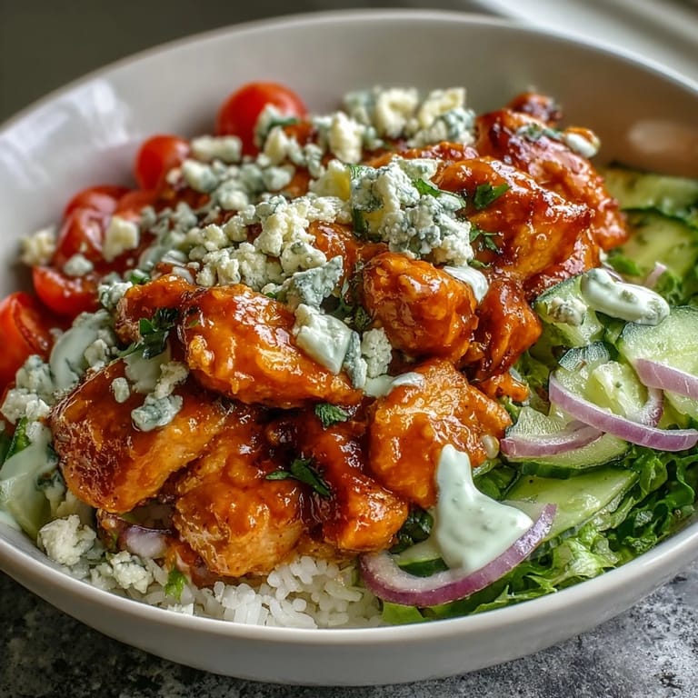 Save A vibrant and spicy Buffalo Chicken Bowl that brings together tender buffalo chicken and fresh, crisp vegetables. This easy American-style main dish is perfect for a quick dinner that doesn't compromise on flavor, featuring a tangy kick from the sauce and a cooling finish from the ranch dressing.