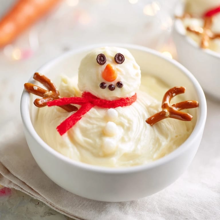 Save A playful and creamy appetizer featuring a festive melted snowman made of cheese and yogurt, perfect for holiday gatherings and sure to delight kids and adults alike.