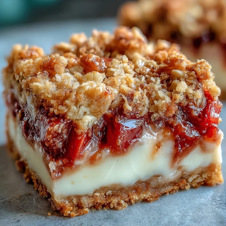 Save My neighbor brought me armfuls of rhubarb one April morning, and I stood in the kitchen wondering what to do with all those tart pink stalks. I'd been craving something that wasn't just a crumble or a pie, something I could pack up and share easily. That's when I remembered the custard bars my grandmother used to make, and I thought: why not marry the two? The result was these layered beauties, tangy and creamy and crumbly all at once, and they disappeared from the tin before they'd even fully cooled.