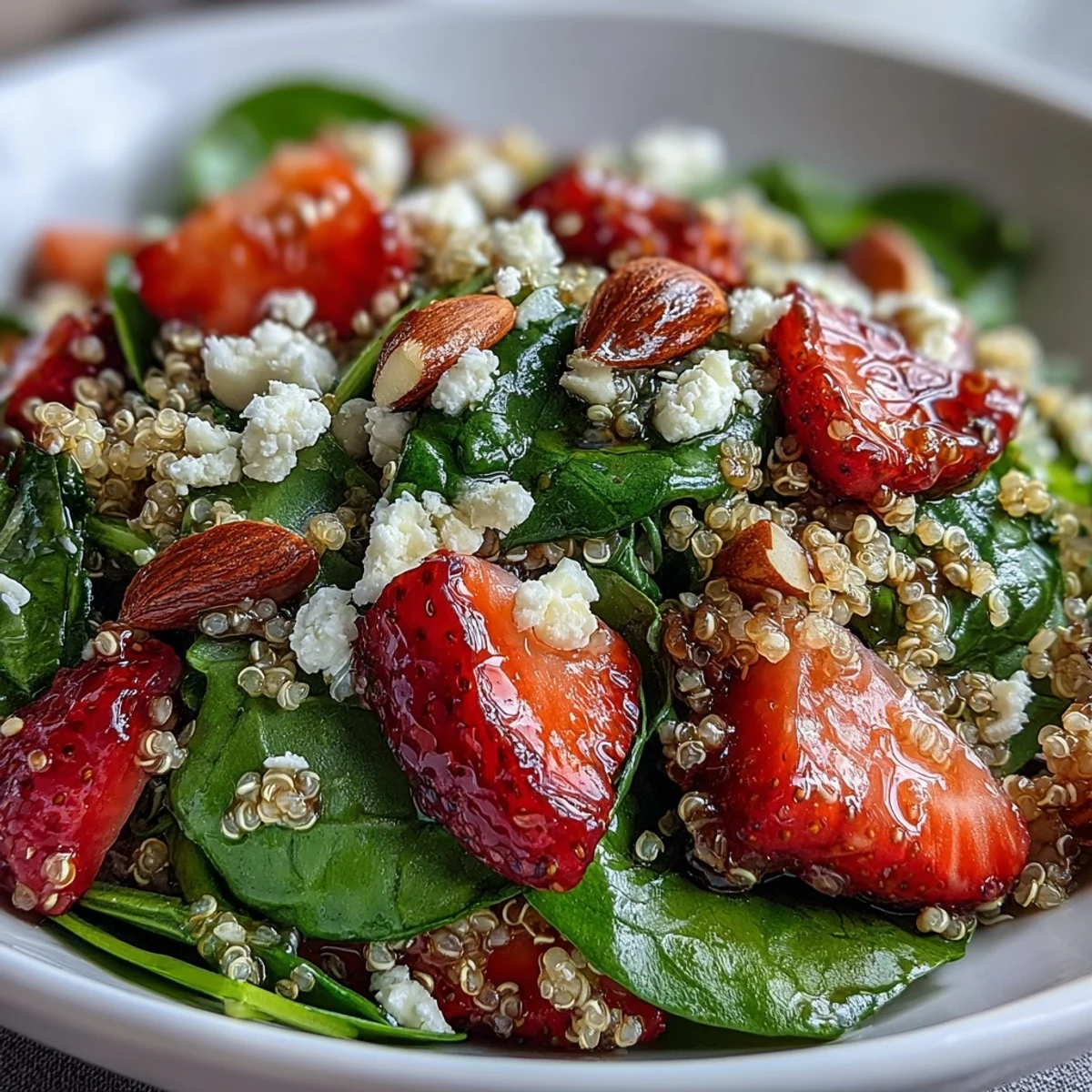 Save This salad brings together protein-packed quinoa with the season's juiciest strawberries and tender spinach leaves. The crunch of toasted almonds and the tang of red onion add texture and depth, while the homemade balsamic vinaigrette ties everything together with its sweet-tart profile. It's a celebration of summer on a plate.