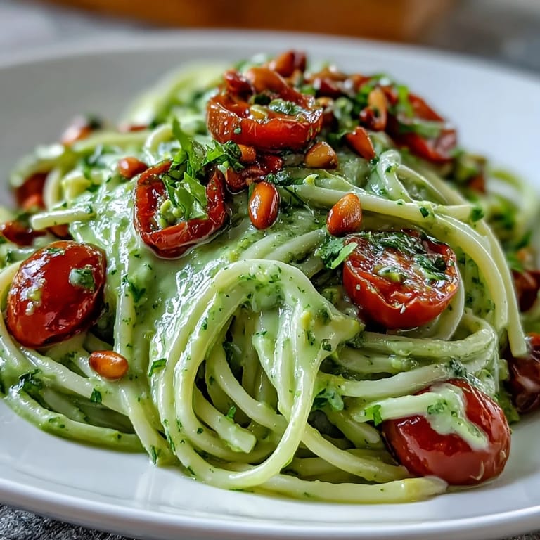 Save This pasta dish captures the essence of modern plant-based cooking—proving that vegan cuisine can be indulgent, satisfying, and incredibly simple to prepare. The combination of buttery avocados and aromatic basil creates a sauce that's reminiscent of a classic cream-based pasta, yet it's entirely plant-powered. The juicy cherry tomatoes add bursts of sweetness that complement the citrusy notes of the lime, while optional toasted pine nuts introduce a delightful textural contrast and nutty dimension.